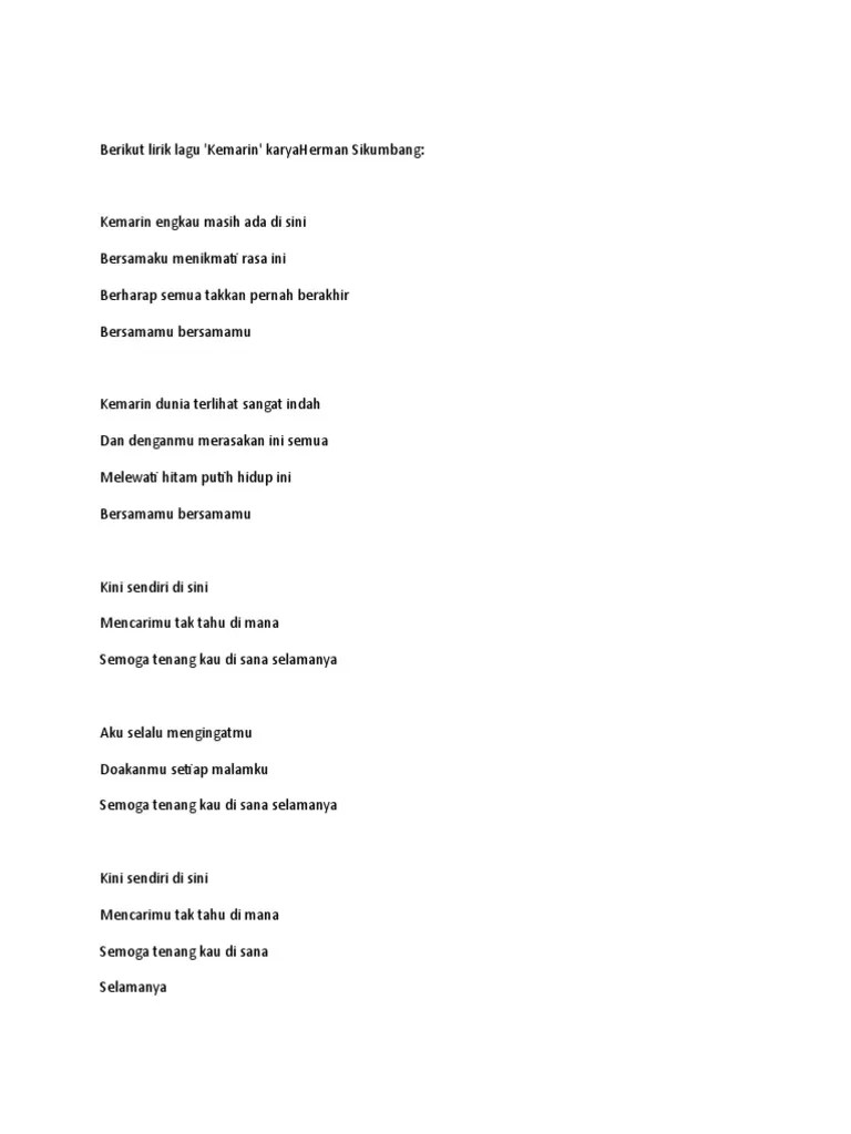 Dan denganmu merasakan ini semua. Semoga tenang kau di sana. Semoga tenang kau di sana. Lirik lagu kemarin seventeen, kini sendiri disini mencarimu tak tahu dimana. Kini sendiri di sini mencarimu tak tahu di mana semoga tenang kau di. S'moga tenang kau di sana. Am dm kini.sendiri di sini. Kemarin kemarin engkau masih ada di sini bersamaku menikmati rasa . Bersamamu kini sendiri di sini mencarimu tak tahu di mana semoga . Am dm aku.s'lalu mengingatmu g c do'akanmu . Melewati hitam putih hidup ini. Dm g/b s'moga tenang kau di sana. Am dm kini.sendiri disini g c mencarimu tak tahu dimana dm g/b s'moga tenang kau disana e selamanya. Mencarimu tak tahu di mana. Mencarimu tak tahu di mana.